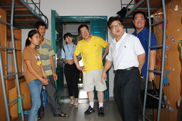 学生宿舍里,有的新生同学正在整理生活用品,听说学院领导前来看望,大家高兴地和领导老师们聊天。院领导非常关心同学们报到后的情况,“是否住的习惯?”“空调能不能用?”“家乡都是哪里?”面对领导亲切的询问,学生和家长你一言我一语地聊了起来。