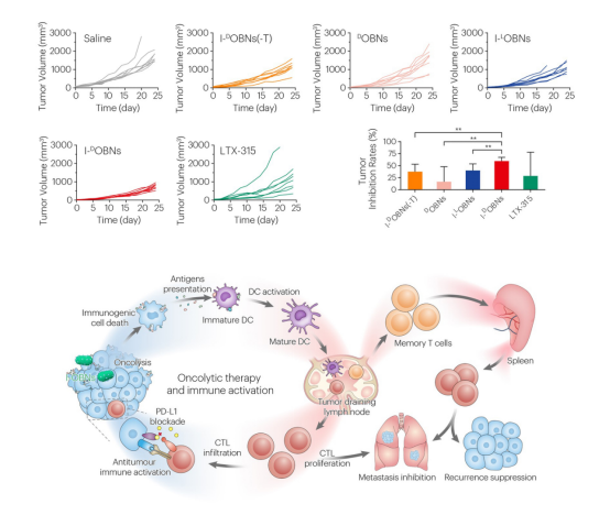 皇冠crown体育官方平台徐翔晖/李亚超研究团队聚焦于溶瘤多肽药物基础与应用研究中的关键挑战。在前期研究中,该团队提出了生物活性多肽药物结构的原始创新设计理论,成功构建了手性仿生溶瘤多肽药物,为解决溶瘤多肽药物活性不足的问题提供了全新的解决方案。近期,研究团队从多肽药物仿生制剂学的角度出发,以多层次模拟溶瘤细菌的结构与功能为思路,成功发展出了可实现系统给药、激活肿瘤微环境、重编程免疫微环境的多肽仿生溶瘤细菌药物。研究结果显示,通过静脉注射仿生溶瘤细菌药物,可实现手性色氨酸支化溶瘤肽的靶向溶瘤效应,融合分子治疗成功解除了溶瘤诱导的免疫抑制,从而有效遏制了荷瘤小鼠模型中的肿瘤增长和肿瘤转移,显著抑制了肿瘤的复发。相比之下,D型仿细菌溶瘤药物(DOBNs)表现出比L型仿细菌溶瘤药物(LOBNs)及临床级溶瘤肽更强的溶瘤疗效。